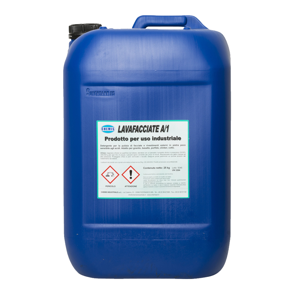 Detersivo fortemente acido, schiumogeno, specifico per la pulizia di facciate e rivestimenti esterni realizzati con materiali poco sensibili agli acidi. Utilizzabile su: granito, basalto, porfido, mattoni e mattonelle in klinker, cemento, ghiaino lavato, pietra serena ecc.